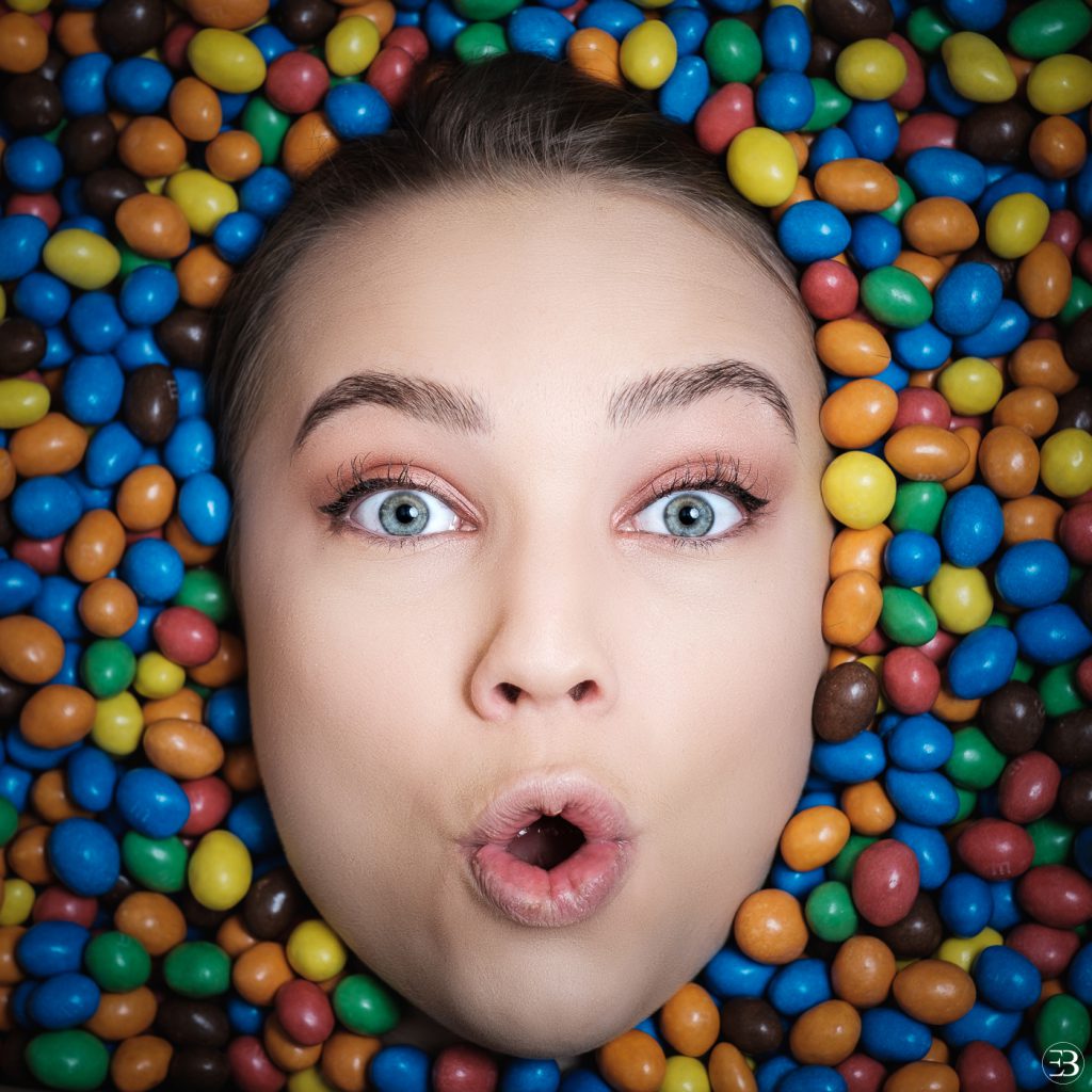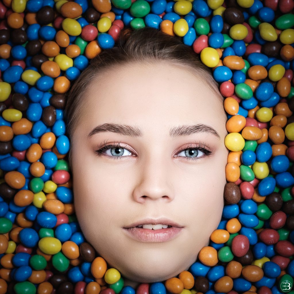 Après avoir pris contact avec elle et soumis mon idée pour la photo que je voulais faire, ne me restait plus qu’à trouver des M&M’s en quantité. En effet, Emma venait d’accepter mon projet de portrait « chocolaté » …