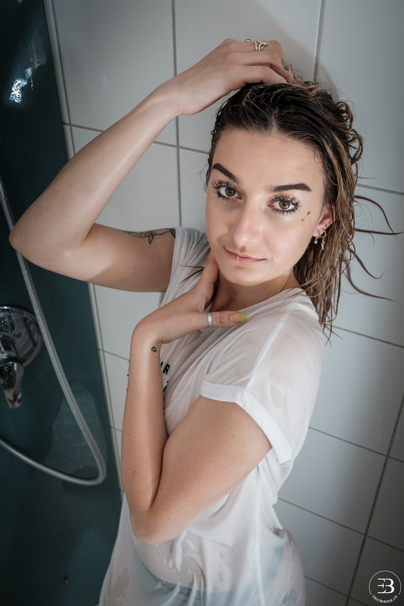 Comme pour les photos dans la neige, Océane a souhaité finir le shooting sur quelque chose de différent. C’est ainsi qu’elle m’a proposé de faire des photos avec un t-shirt blanc sous la douche. La salle de bain étant exiguë, nous avons fait de notre mieux pour ne pas inonder cette dernière ainsi que la chambre.