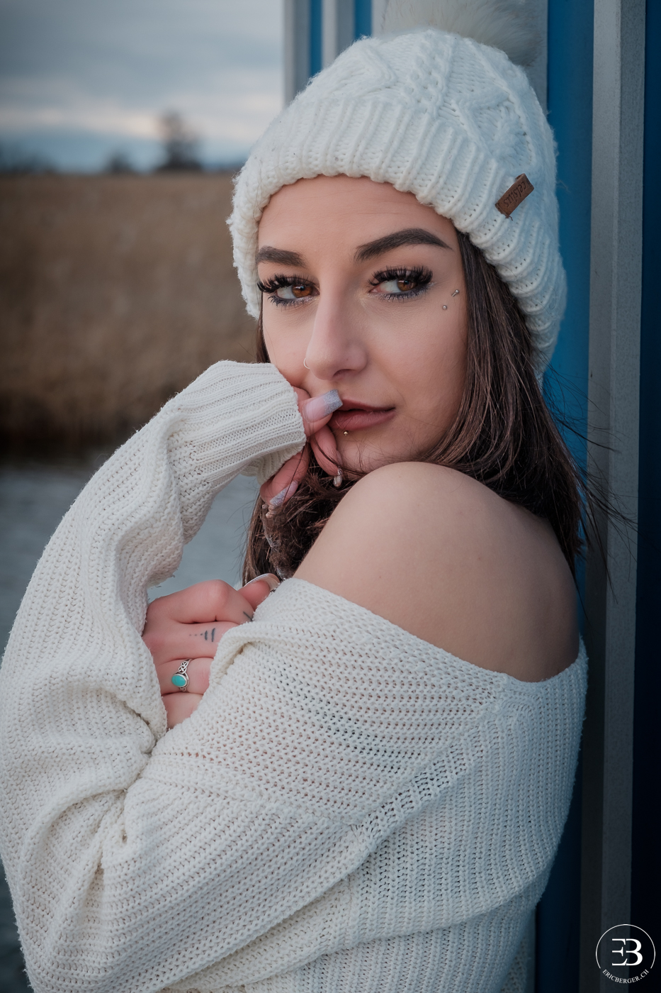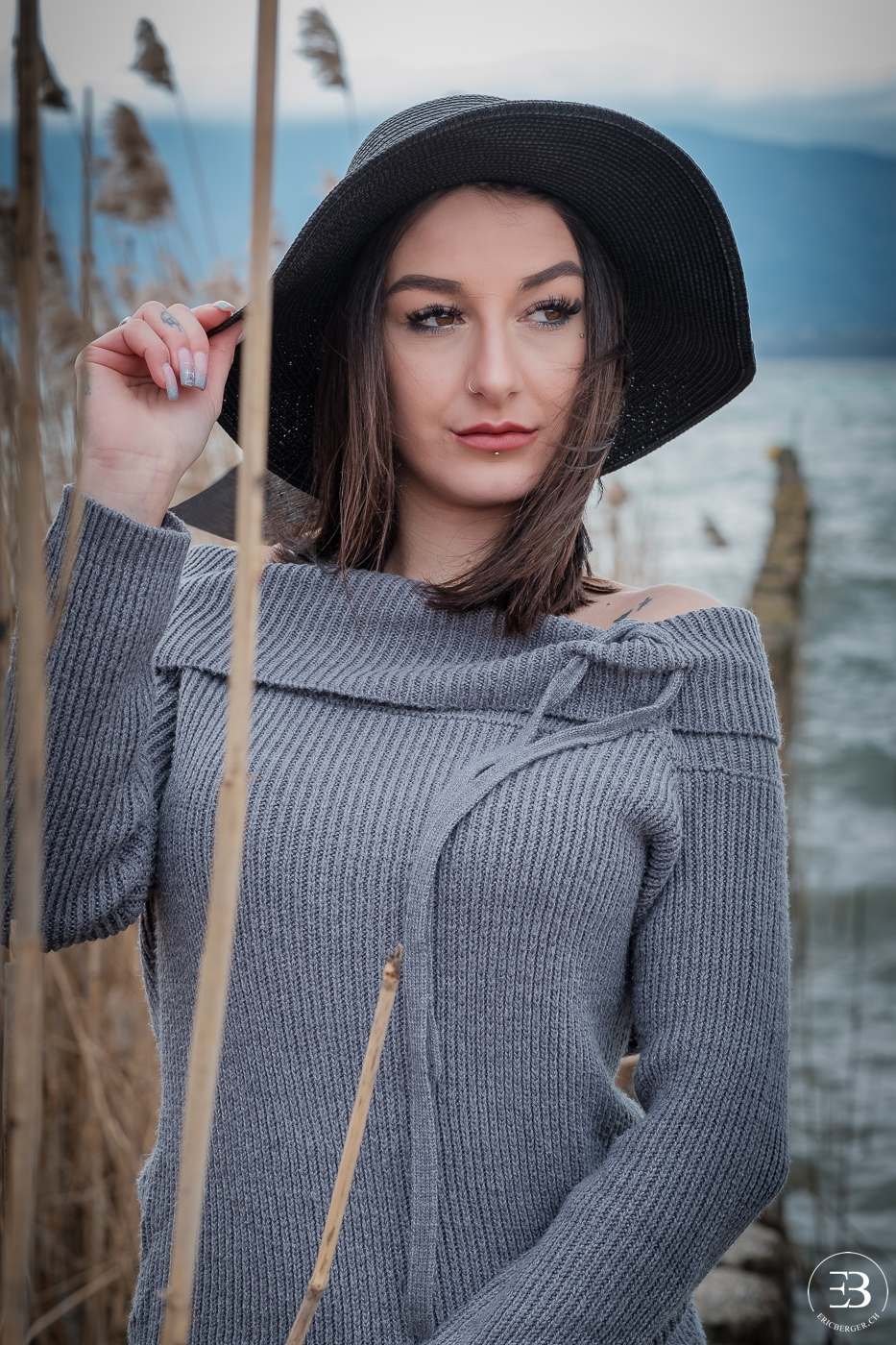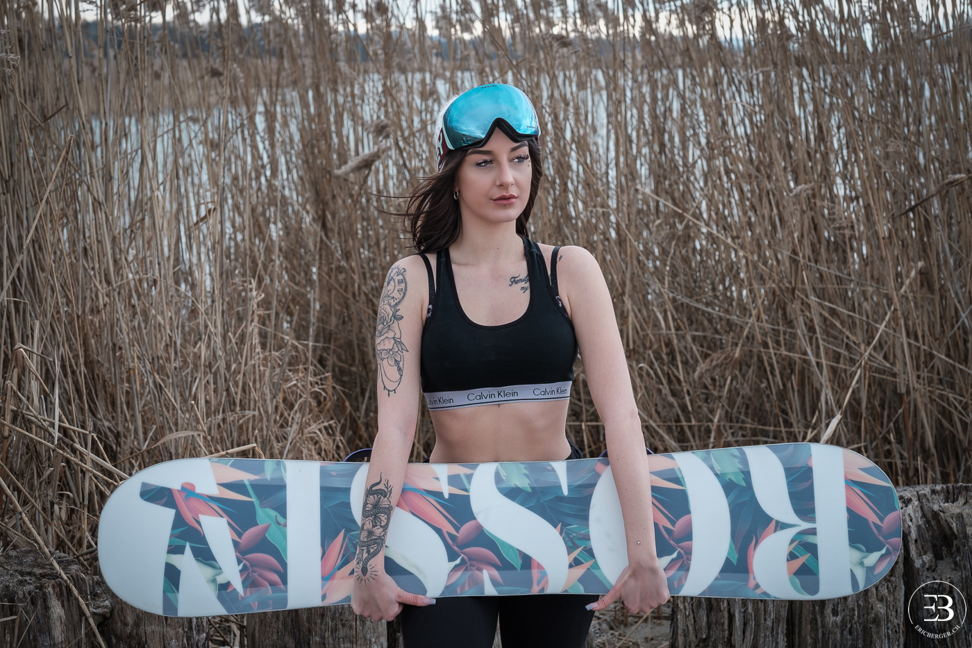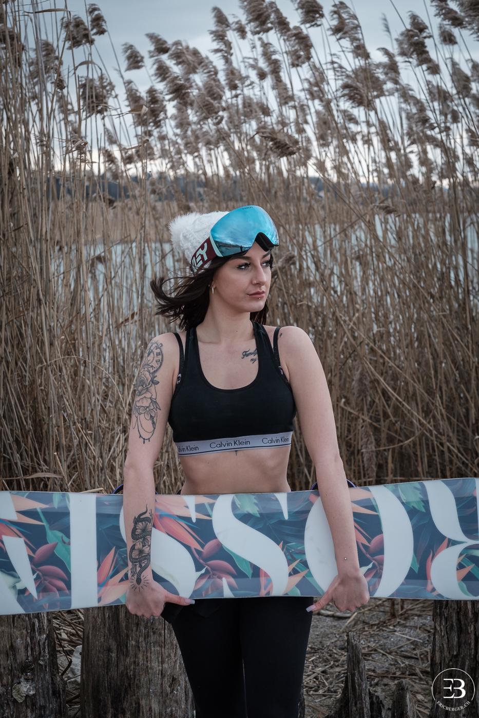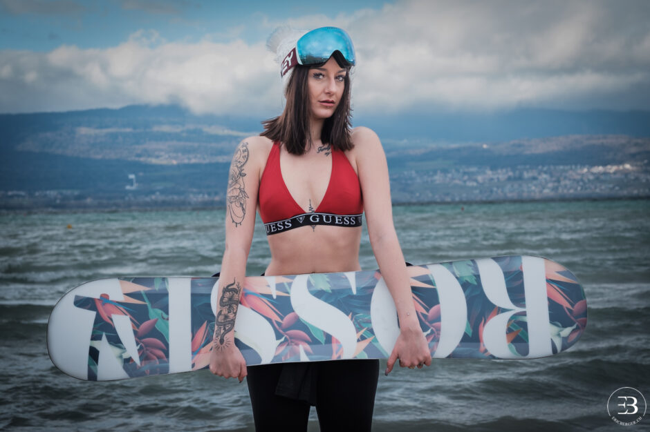 Le shooting prévu avec Océane allait demander du courage. Comme d’habitude, il s’agissait de créer des images décalées. Elle a emprunté un snowboard et nous sommes partis sur la plage. Une fois l’endroit atteint et après avoir croisé des promeneurs surpris du matériel que nous avions avec nous, Océane, avec beaucoup de courage, a enlevé sa doudoune pour poser en sous-vêtements au bord du lac.