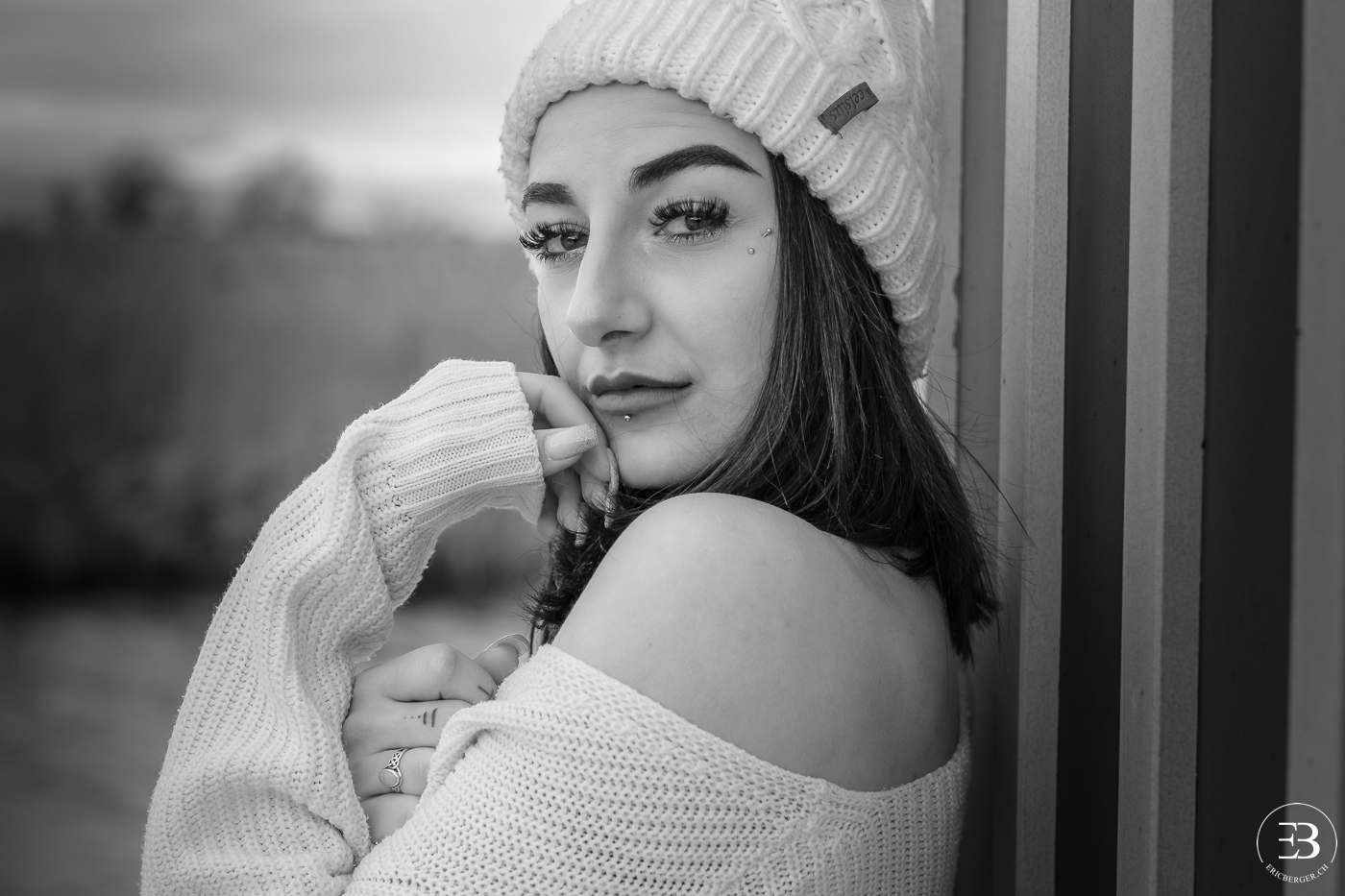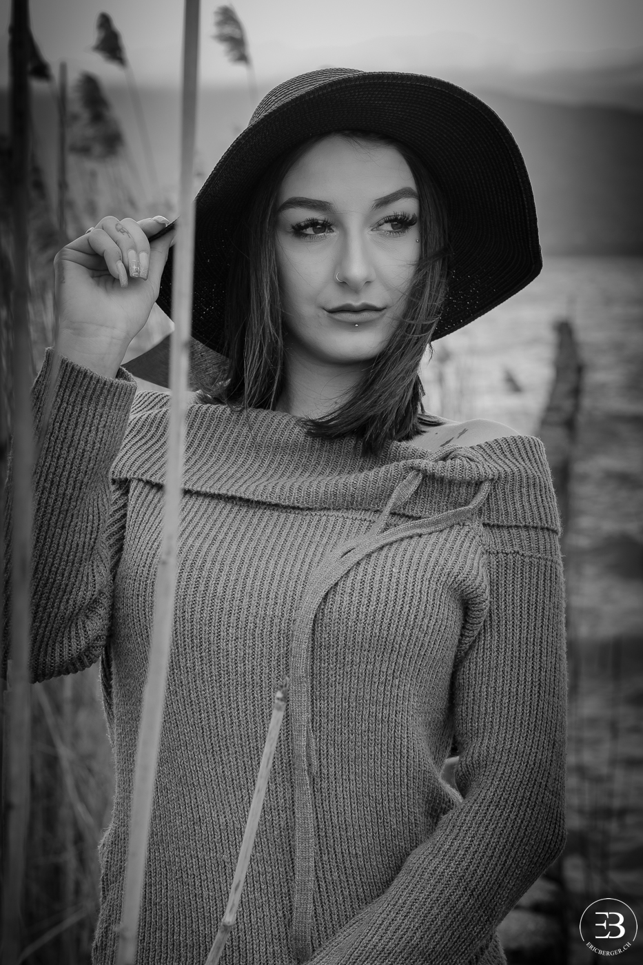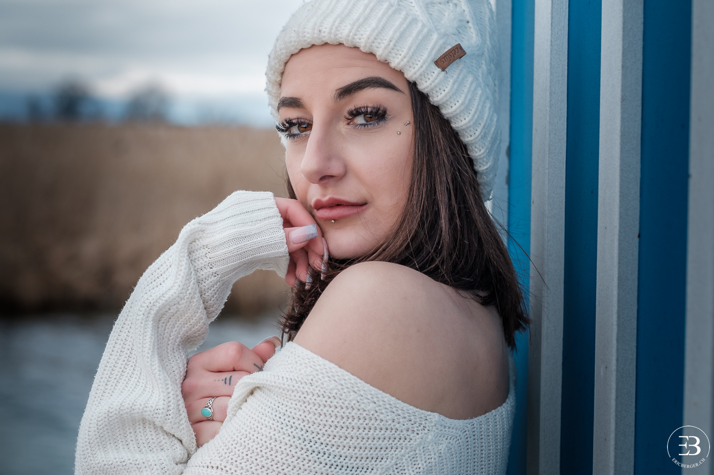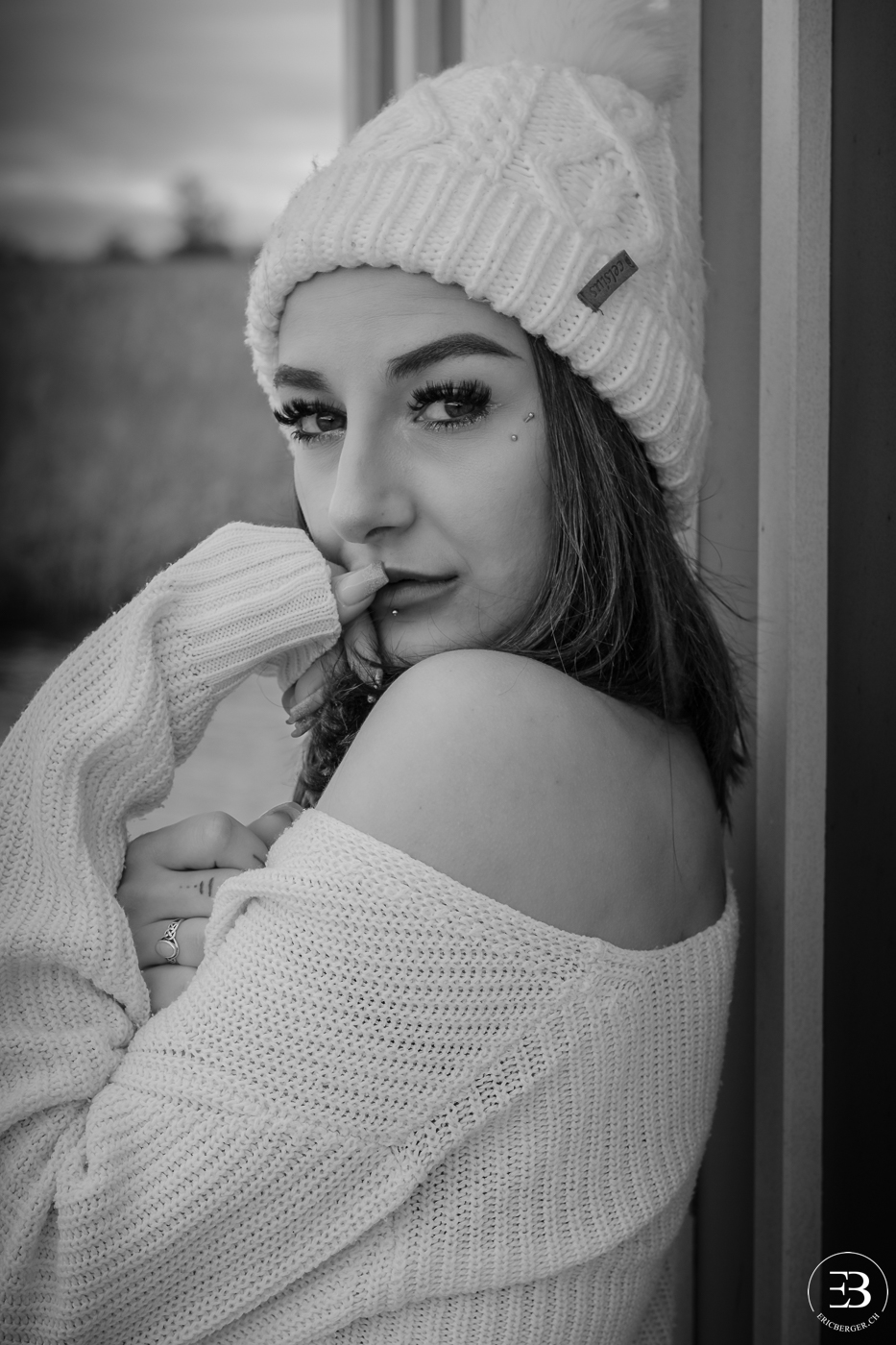 Le shooting prévu avec Océane allait demander du courage. Comme d’habitude, il s’agissait de créer des images décalées. Elle a emprunté un snowboard et nous sommes partis sur la plage. Une fois l’endroit atteint et après avoir croisé des promeneurs surpris du matériel que nous avions avec nous, Océane, avec beaucoup de courage, a enlevé sa doudoune pour poser en sous-vêtements au bord du lac.